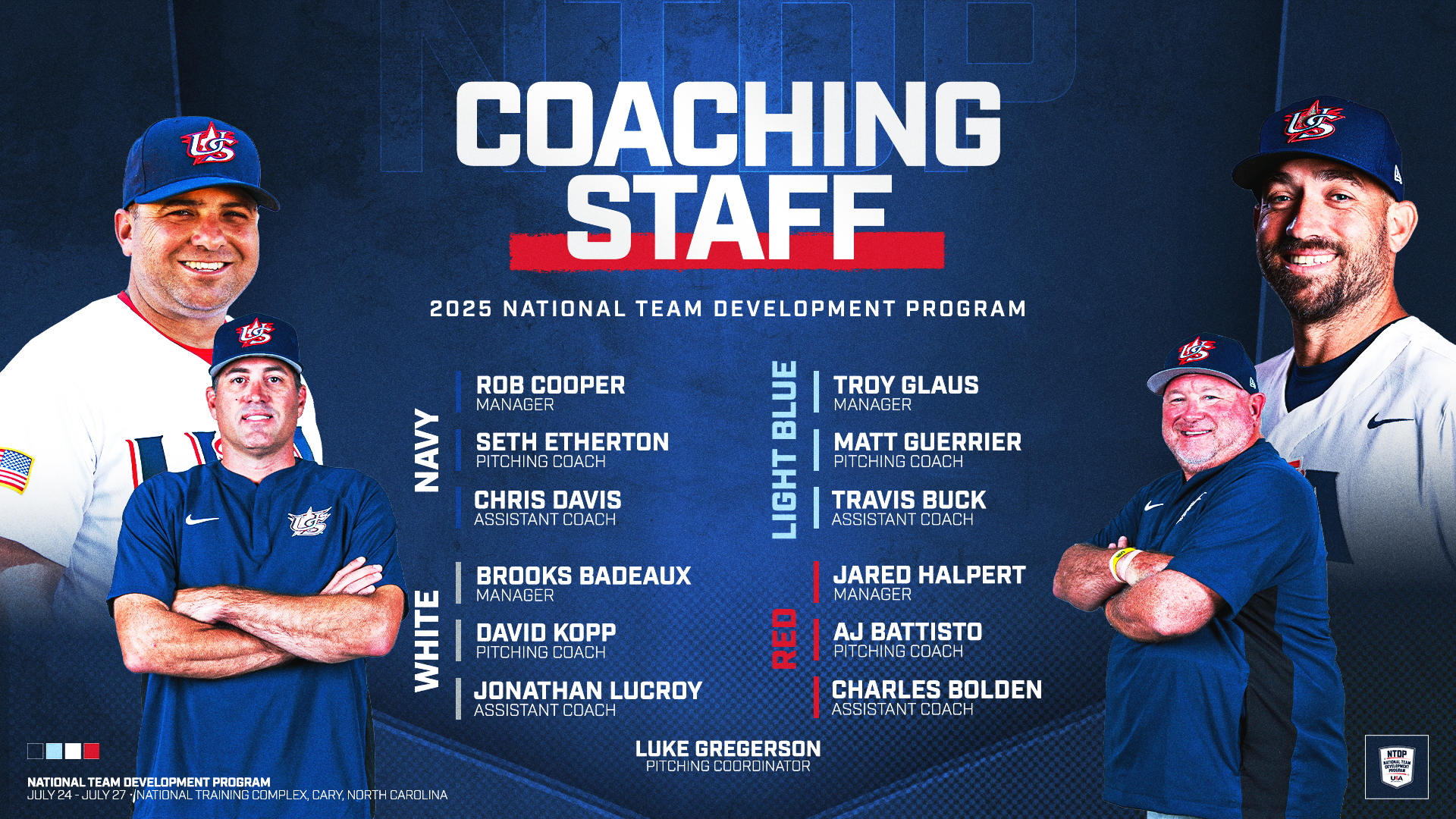 In total, the 2025 16U/17U NTDP coaching staff combines for 70 years of MLB playing experience, 54 seasons of coaching at the college level, and 18 years of high school coaching experience. Badeaux, Cooper, Glaus, and Halpert will serve as managers, while Battisto, Etherton, Guerrier, and Kopp assume pitching coach duties. Bolden, Buck, Davis, and Lucroy are set to be the assistant coaches.