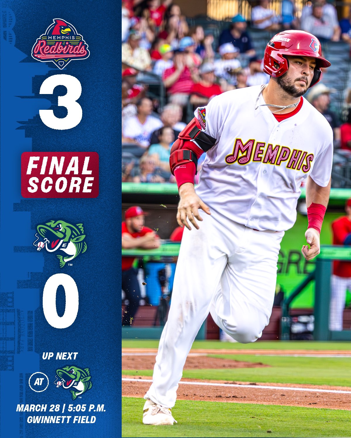 MEMPHIS, Tenn. – The Memphis Redbirds took the first game of the 2026 season by a final score of 3-0 on Friday night at the Gwinnett Stripers (Triple-A, Atlanta Braves).