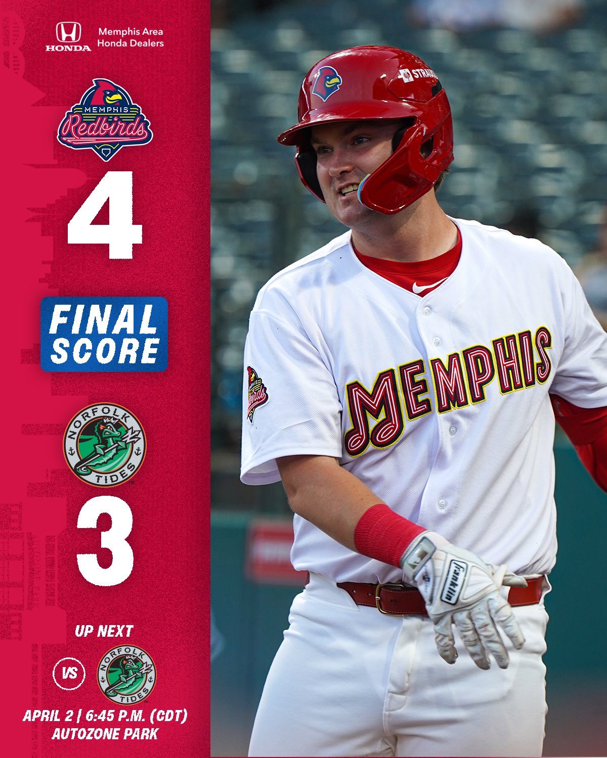 The Memphis Redbirds return to AutoZone Park on Thursday, April 2 to continue a six-game series against the Norfolk Tides (Triple-A, Baltimore Orioles) with first pitch scheduled for 6:45 p.m. CDT.