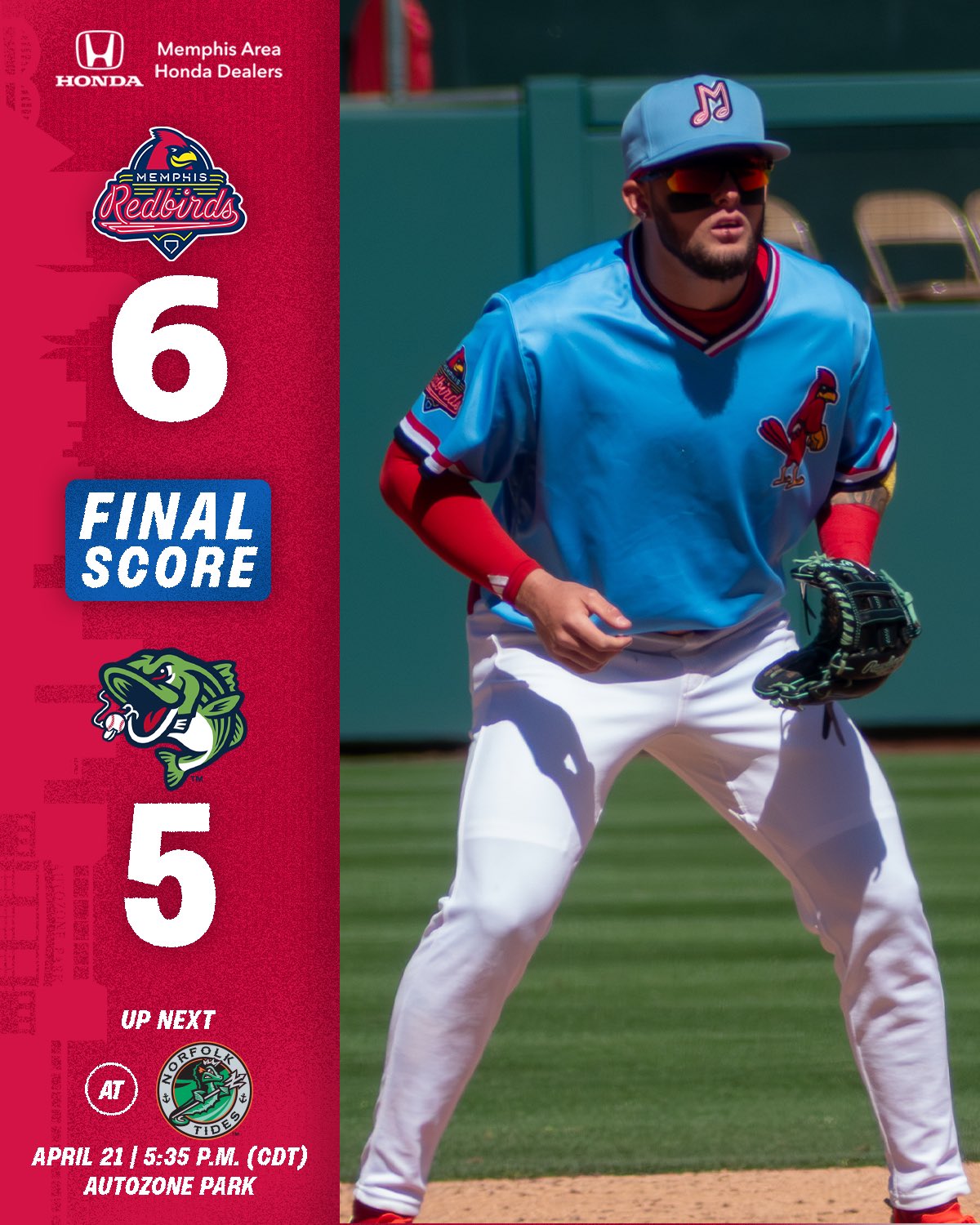 The Memphis Redbirds return to AutoZone Park on Sunday, April 19 to wrap up a six-game series against the Gwinnett Stripers (Triple-A, Atlanta Braves) with first pitch scheduled for 1:05 p.m. CDT.